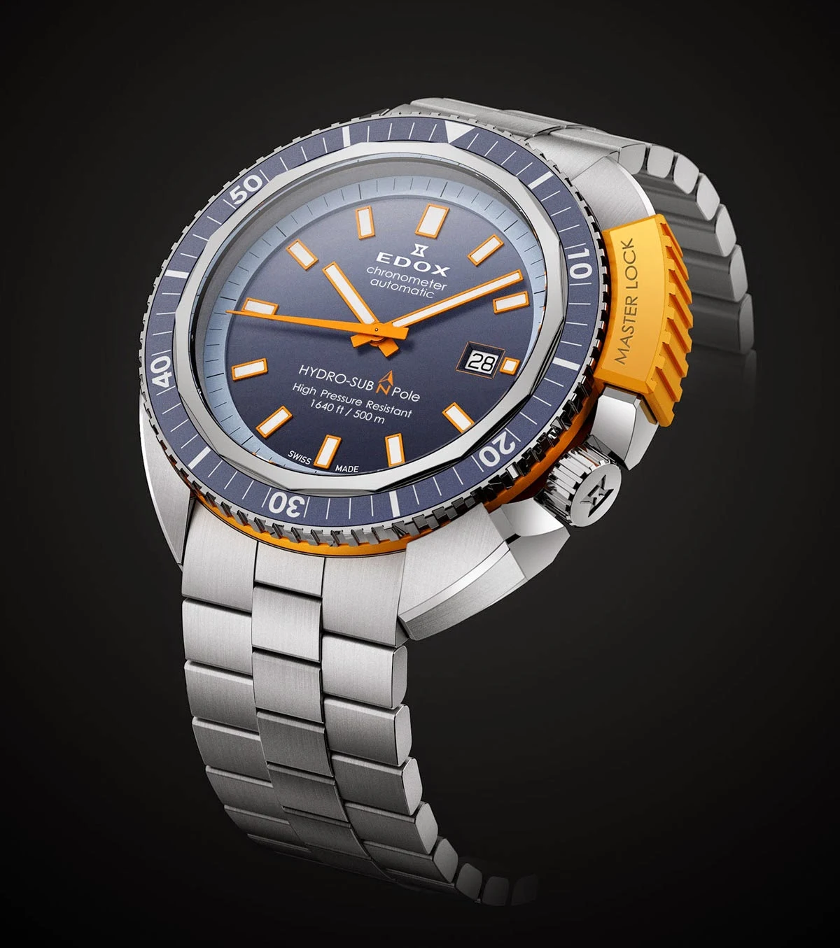 Edox Hydro Sub Automatic Date. In 2014 Edox introduced the new Hydro Sub Automatic Date whose design was inspired by the 1965 model with the integration of the new, distinctive "Master Lock" crown protector system. The Hydro Sub Automatic Date has a Swiss retail price of Swiss Francs 1,490. The price of the North Pole Mission Limited Edition is Swiss Francs 2,490. Hydro Sub North Pole Mission Limited Edition Ref. 80201