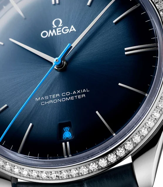 Instead of the date, the aperture at 6 o'clock displays an Orbis Teddy Bear, a reference to the cuddly toys given to children undergoing eye surgery. The varnished seconds hand has the same light blue of the charming mascot.
